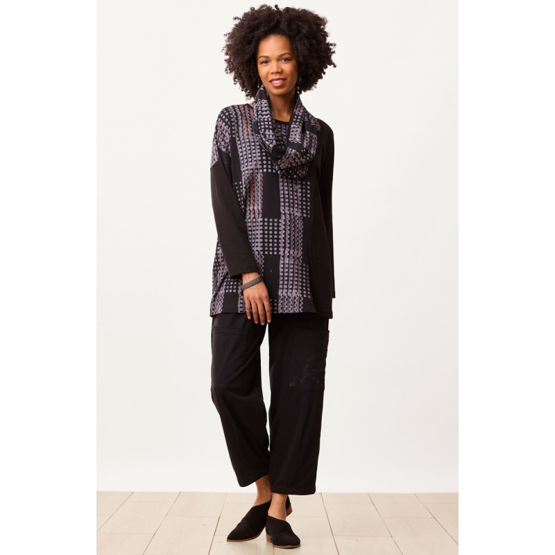 Smooth jersey pant with flattering barrel-leg is your new basic knit pant to pair with Fall colors. Six pockets offer plenty of space to carry your essentials. Elastic waist. Hand embroidery embellishments.