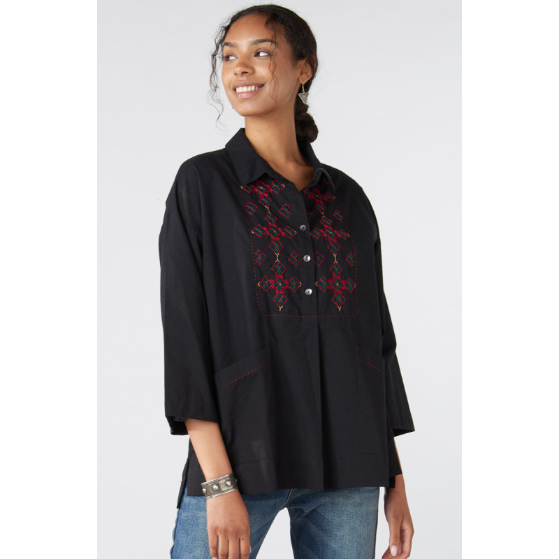 The star of this eco-friendly shirt-collar top is the artistic red and green hand embroidery on the soft black organic cotton. Pullover style has a button yoke with center pleat and a slightly high-low hem with side slits. Dropped shoulders, three-quarter length sleeves. Angled front pockets with embroidery accents. Generously cut - consider sizing down for a less oversized look.