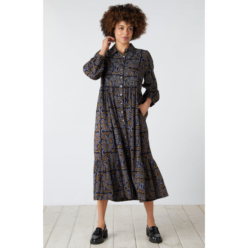 Block prints in shades of dusty blue and green define this maxi-length dress with distinctive side flounces that give a great swingy sweep. Shirt collar and button-front, with a softly gathered waist. Long sleeves with button cuffs. Hand embroidery embellishes the bodice.