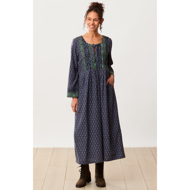 Easy long dress with gentle waist pleats combines rich blue and green block prints. The hand embroidered contrast yoke features a notch-neck with a decorative front tie, and long sleeves have matching contrast cuffs. Back tab ties let you adjust to your preferred fit.