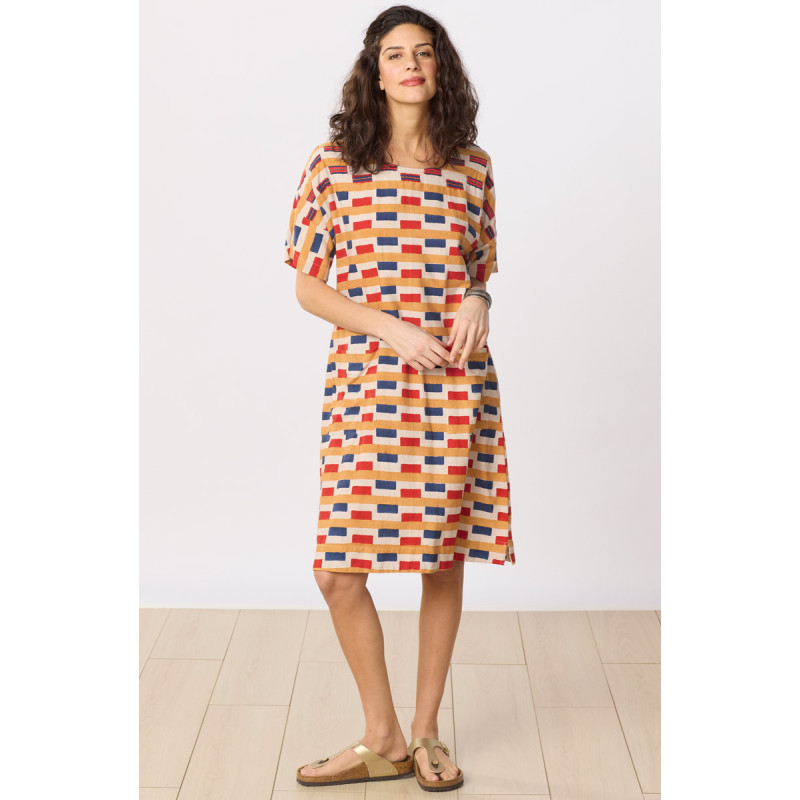 Pullover shift dress in cotton woven with a hint of linen for a smooth texture. Energized with block prints in red, blue and gold on natural off-white, this easy-on dress has dropped shoulders and short sleeves. Hand embroidery highlights on shoulders.
