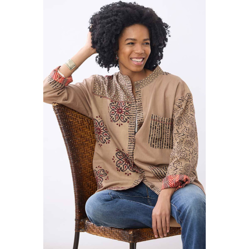 Button-front reversible jacket with two distinctive looks. A warm khaki twill handprinted in a collage of designs reverses to autumnal red and green batik blockprint. Hand embroidery accents on both sides. Long sleeves are ready to cuff.