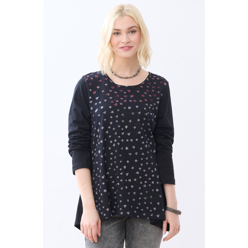 Easy scoop neck jersey top in grey batik block print with solid black sleeves and side panels. Handkerchief hem gives a great swingy sweep. Hand embroidery accents at neckline.