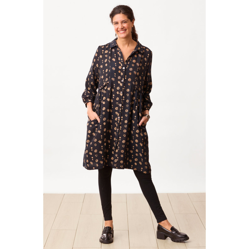 Soft black cotton crepe shirt dress, batik blockprinted in stone brown, has special styling. Side waist gathers have button tabs that let you adjust the fit. Back gathers give the skirt a gentle sweep. Long sleeves with button cuffs. Hand embroidery accents the print design.
