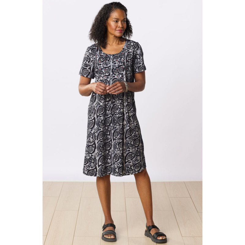 Elevate your style with this batik block print jersey dress. Hand embroidery highlights the bodice pleats which give gentle gathers. Side slits.