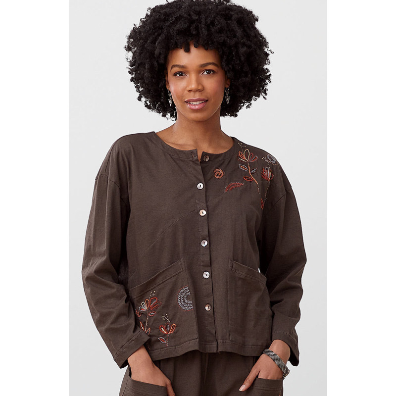 Diagonal seaming and artful hand embroidery elevate this simple jersey cardigan into something special. Soft mineral grey knit with colorful embroidered florals, ready to wear alone or layered.