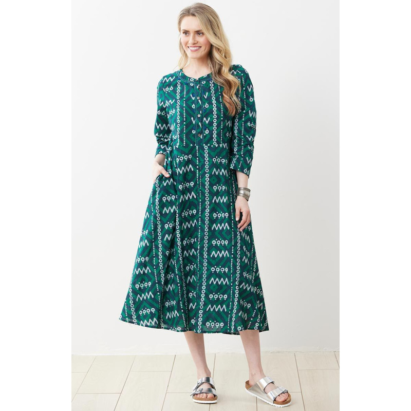 Jade green and navy blue blockprint overprinted on white batik designs bring energy to this round-neck, button placket dress. Hand embroidery defines the placket and neckline.