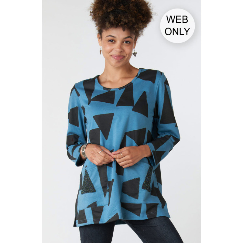 Easy medium weight knit tunic with blockprints on blue-grey French terry. Angled front pockets have hand embroidery accents. Side slits.